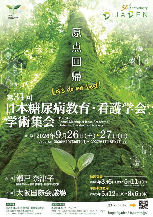第31回日本糖尿病教育・看護学会学術集会を、2026年9月26日・27日に大阪国際会議場で開催いたします。テーマは「原点回帰 — Let’s do our best!」です。