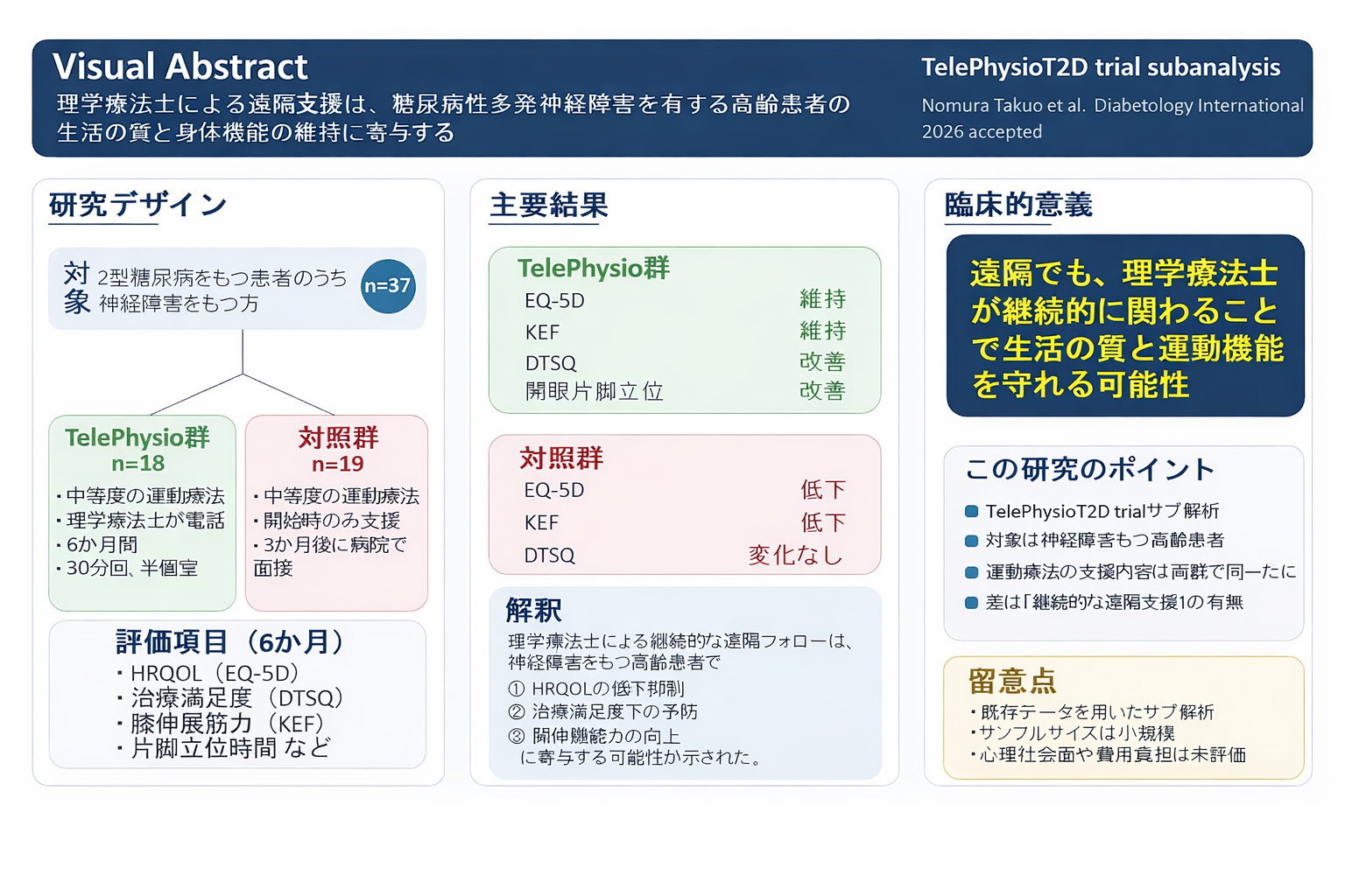 対象はDPNを有する2型糖尿病をもつ高齢患者37名で、理学療法士による遠隔支援群(TelePhysio群)18名と対照群19名を比較しました。両群とも同一の中等度強度の運動療法を実施し、TelePhysio群では半年間にわたり電話を用いた週1回(30分/回)の遠隔支援を行いました。その結果、TelePhysio群では健康関連QOL(EQ-5D)および膝伸展筋力が維持され、治療満足度の向上が認められました。一方、対照群ではEQ-5Dと膝伸展筋力の低下がみられ、治療満足度に大きな変化は認められませんでした。