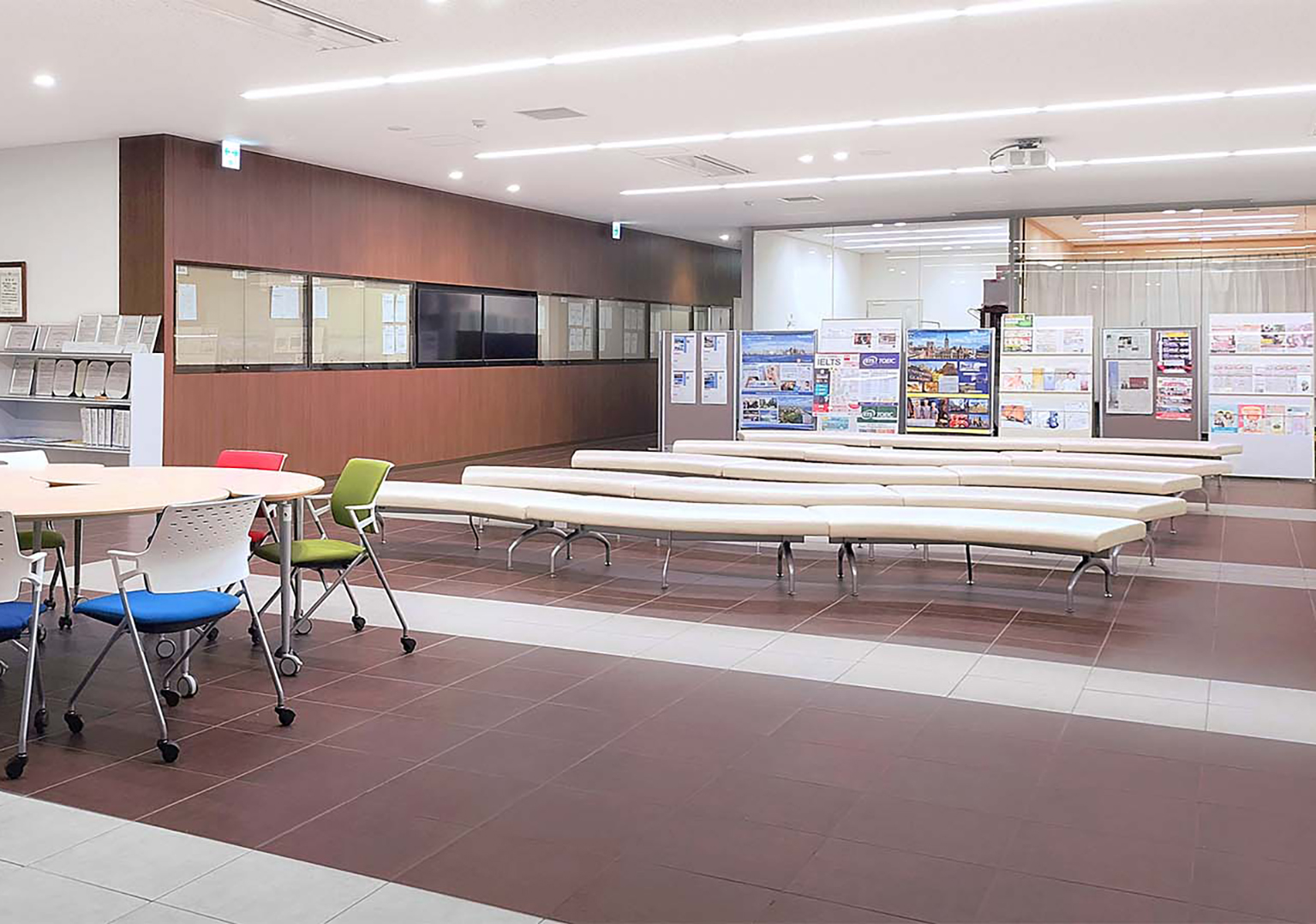 附属病院すぐそばの関西医科大学交流センターに開設された「ラウンジ」。どなたでもご利用いただける森の中をイメージした無料の休憩スペースです。ラウンジ内はWi-Fiを完備しており、附属病院で受付された患者さんの呼び出し機にも対応しています。
