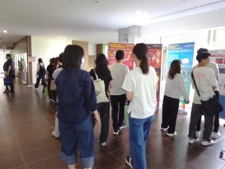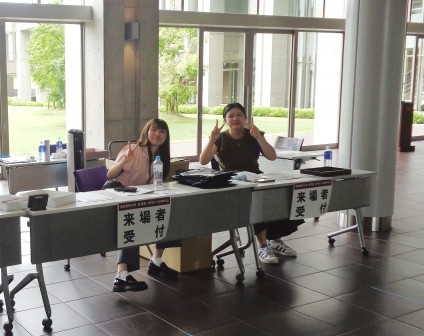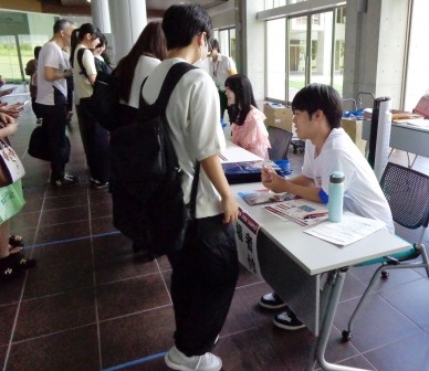 エントランスホールでは、学生スタッフが参加者をお迎えし、大学案内・学生募集要項、参加者限定のオリジナルグッズ等を配付しました。