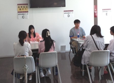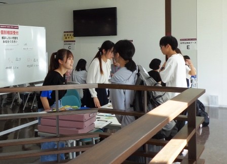 写真は学生生活の相談ブースで、学生スタッフが相談を受けている様子です。