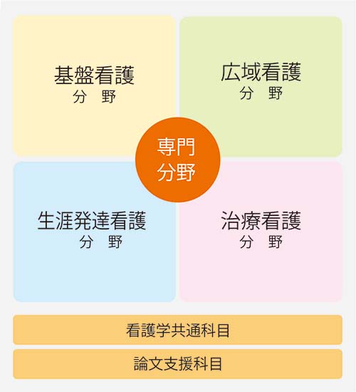| 共通科目 | 看護学共通科目 | ・看護と科学 ・看護の概念・理論構築 ・看護学研究法発展 ・質的看護研究法発展 ・量的看護研究法発展 ・看護高等統計学 ・看護の課題・展望Ⅱ |