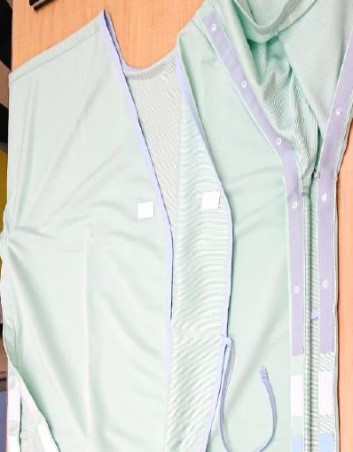 手術の際に患者さんが着用する服で、従来は生地やマジックテープのせいで着心地・肌触りが悪く、胸元・裾がはだけがちなど、手術する側の利便性が優位に設計されていた術衣(通称「オペ着」)を改良。肌触りの良い布地を使いつつ、ボタン式ではだけにくく繰り返しの洗濯にも耐えられる上に、ボタンの色を変えて留め間違いを防いだりドレーン管の留置用にマジックテープを残したりと利便性も犠牲にしない製品です。
