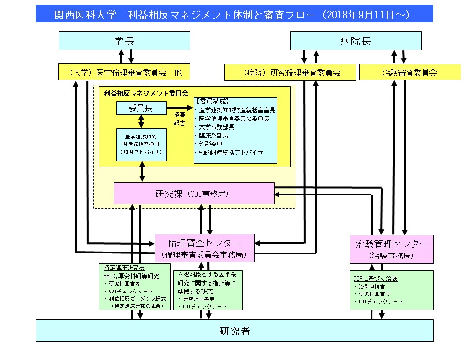 これに対応して、関西医科大学では、「利益相反ポリシー」及び「関西医科大学利益相反マネジメント規程」並びに「運用マニュアル」を定めました。 本学においては、これらに基づいて臨床研究を実施しています。