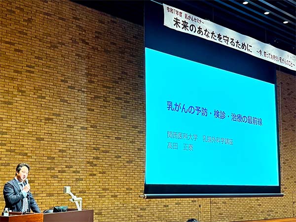がん対策・啓発活動の取り組みとして、11月1日(土)、枚方市主催の乳がんセミナー「未来のあなたを守るために ~今、知っておきたい乳がんのこと~」が開催され、本学乳腺外科学講座 髙田正泰教授が乳がんの予防・検診・治療の最前線について講演いたしました。